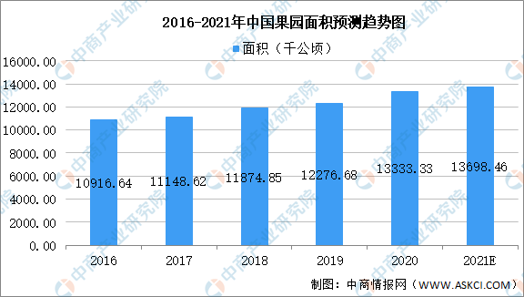 數(shù)據(jù)顯示,我國果園面積由2016年10916.64千公頃增至2019年12776.68千公頃。2020年我國果園面積穩(wěn)定在13333.33千公頃左右,預計2021年我國果園面積可達13698.46千公頃。