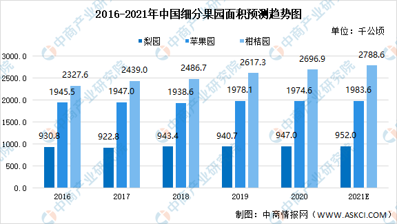 數(shù)據(jù)顯示,2016-2019年我國各類水果果園面積穩(wěn)定增長。2019年我國梨園、蘋果園、柑桔園面積分別為940.7千公頃、1978.1千公頃、2617.3千公頃。預計2021年我國梨園、蘋果園、柑桔園面積分別為952.0千公頃、1983.6千公頃、2788.6千公頃。