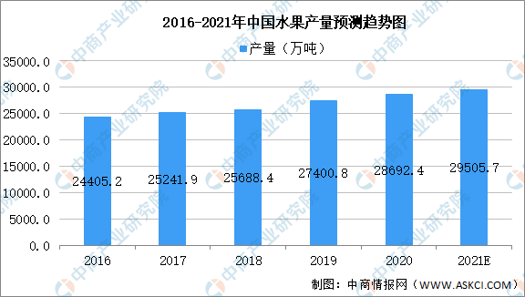 數(shù)據(jù)顯示,我國水果產(chǎn)量穩(wěn)定增長。由2016年24405.2萬噸增至2020年28692.4萬噸,年均復合增長率為4.1%。中商產(chǎn)業(yè)研究院預測,2021年我國水果產(chǎn)量可達29505.7萬噸。