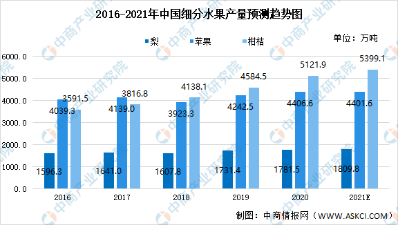 數(shù)據(jù)顯示,2020年我國梨、蘋果、柑桔產(chǎn)量分別為1781.5萬噸、4406.6萬噸、5121.9萬噸。預計2021年我國梨、蘋果、柑桔產(chǎn)量分別為1809.8萬噸、4401.6萬噸、5399.1萬噸。