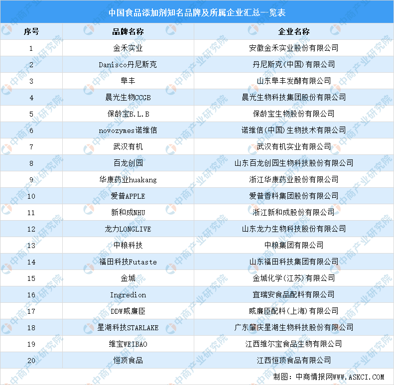 我國知名食品添加劑品牌有金禾實業(yè)、Danisco丹尼斯克、阜豐、晨光生物CCGB、保齡寶B.L.B、novozyaes諾維信、武漢有機、百龍創(chuàng)園等。下圖為我國食品添加劑知名品牌及所屬企業(yè)匯總一覽表: