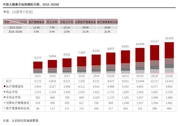 與此同時(shí),中國(guó)大健康產(chǎn)業(yè)市場(chǎng)規(guī)模保持穩(wěn)定增長(zhǎng),2015到2019年,中國(guó)大健康產(chǎn)業(yè)的市場(chǎng)規(guī)模由5.2萬億人民幣增至8.1萬億人民幣,并預(yù)計(jì)將繼續(xù)提升,到2024年達(dá)到約13.4萬億人民幣。