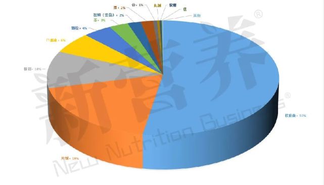 從產(chǎn)品劑型上看,保健食品的劑型種類較多,包括常見的軟膠囊、片劑、粉劑、顆粒劑、口服液等,以及食品形態(tài)的飲料、酒劑、茶劑、凝膠糖果等。其中,軟膠囊類產(chǎn)品的獲批數(shù)量最多,為1225款,占保健食品備案及注冊(cè)總量的53%;此外,片劑、粉劑、口服液類產(chǎn)品的獲批數(shù)量較多,分別為432款、245款和141款,分別占保健食品注冊(cè)總量的18%、10%和6%。