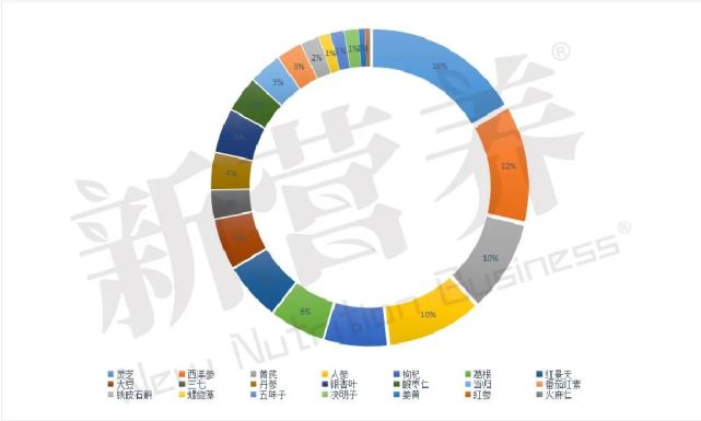 其中,在植物性營(yíng)養(yǎng)素類別中,靈芝(含靈芝孢子,16%)、西洋參、黃芪(10%)、枸杞(7%)等傳統(tǒng)中藥類原料居多;葛根、紅景天、三七等藥食同源的中藥材也也常被添加在保健食品中。