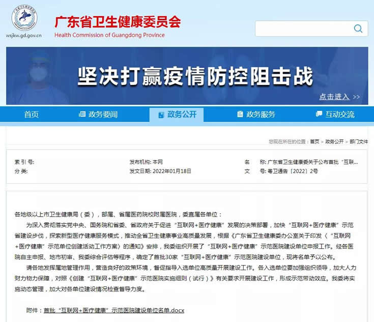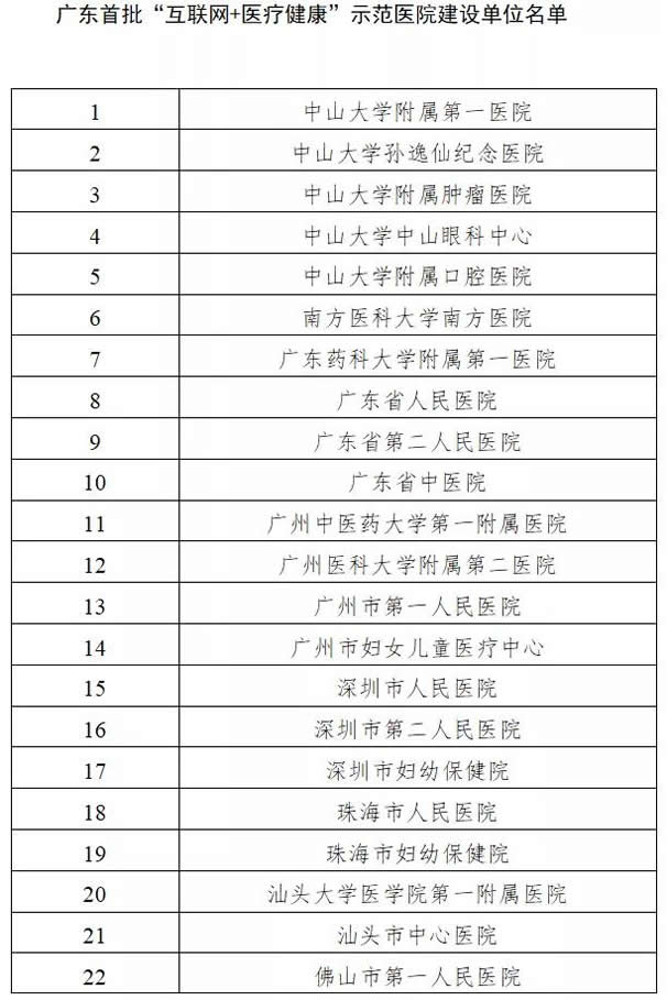 1月18日,廣東省衛生健康委發布通知,公布首批“互聯網+醫療健康”示范醫院建設單位名單,位于廣州、深圳、珠海、汕頭等12地市的30家醫院入選,具體名單如下: