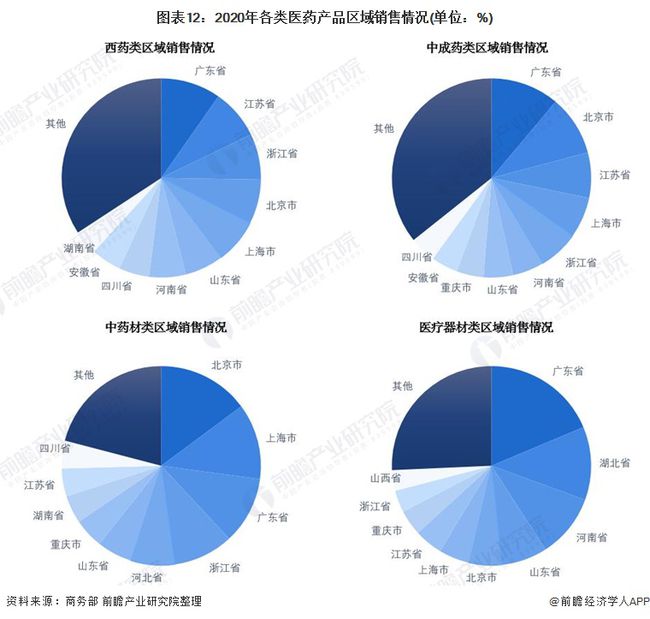 從四大類藥品區域銷售情況可見,廣東省醫藥流通市場規模在全國表現突出,其次是北京和上海。