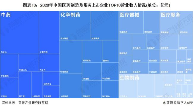 2020年醫藥制造企業中中藥和化學制藥板塊營業收入排名前十上市公司規模較大。隨著《關于加快中醫藥特色發展的若干政策措施》等政策發布,中藥行業產業活力進一步激發。上市企業中,白云山、云南白藥、步長制藥等2020年業績表現突出。化學制劑板塊近年來持續受到控費、帶量采購、醫保談判等政策壓制,收入和利潤增速放緩,頭部企業華東醫藥、復星醫藥等企業加大對創新藥的研發與投入有望在未來開啟新一輪增長曲線。醫療器械板塊將保持中長期從低端向高端轉型、從本土走向國際化、多元化布局發展方向。疫情或加速國產品牌出海,渠道推廣有望加速。海外疫情持續蔓延,尤其是以印度為代表的發展中國家存在醫療資源明顯不足的短板,驅動國內抗疫物資出口持續旺盛,2020年邁瑞醫療、英科醫療、振德醫療業務收入在該板塊上市企業中表現優異,優質民族品牌正加速海外市場拓展和品牌建設。生物制品整體板塊受益于新冠疫情各國對疫苗的旺盛需求,實現高增速,細分領域中疫苗、血制品等均呈現高景氣度,潛力巨大,以遼寧成大、智飛生物等為代表,行業內企業加速成長。醫療服務龍頭企業(如藥明康德、愛爾眼科、迪安診斷等)優勢進一步擴大,有望憑借品牌效應和規模效應進一步加速擴張步伐,拓展全國乃至全球醫療服務市場,打開新的成長空間。