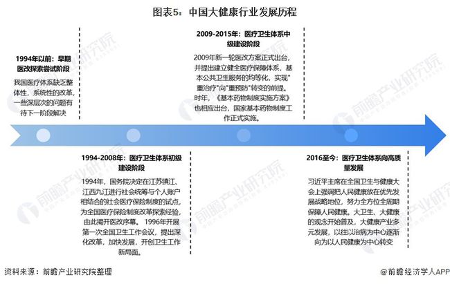 1994年之前,我國醫療行業改革仍處于探索階段,伴隨著醫療機構市場化的是與非的爭議,各項探索性改革進行,但總體仍缺乏整體性,系統性的改革,一些深層次的問題尚未解決。1994年,國務院決定在江蘇鎮江、江西九江進行社會統籌與個人賬戶相結合的社會醫療保險制度的試點,為全國醫療保險制度改革探索經驗,由此揭開醫改序幕。1996年開展第一次全國衛生工作會議,提出深化改革,加快發展,開創衛生工作新局面。2009年新一輪醫改方案正式出臺,并提出建立健全醫療保障體系,基本公共衛生服務的均等化,實現"重治療"向"重預防"轉變的前提。時年,《基本藥物制度實施方案》也相應出臺,國家基本藥物制度工作正式實施。由此,我國醫療衛生體系公平性和可及性加速提升。2016年習近平主席在全國衛生與健康大會上強調把人民健康放在優先發展戰略地位,努力全方位全周期保障人民健康。大衛生、大健康的觀念開始普及,以往以治病為中心逐漸向為以人民健康為中心轉變,此后,中央和地方政府繼續出臺政策促進大健康產業多元發展。隨著我國社會經濟的發展,人民的深層次健康意識覺醒,人民對健康這一概念有了更高質量的理解和追求。