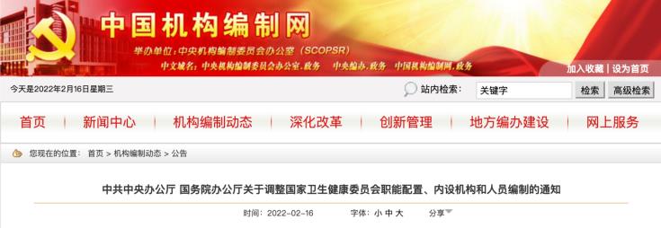 根據《中國共產黨機構編制工作條例》和黨中央關于疾病預防控制工作的決策部署,經報黨中央、國務院批準,現將國家衛生健康委員會職能配置、內設機構和人員編制調整事項通知如下。