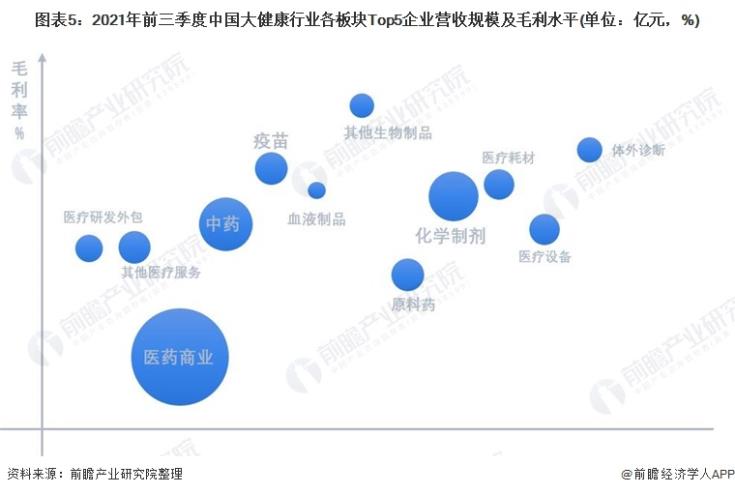圖表5:2021年前三季度中國大健康行業(yè)各板塊Top5企業(yè)營收規(guī)模及毛利水平(單位:億元,%)