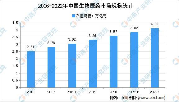 據悉,2020年,藥審中心受理1類創新藥注冊申請共1062件(597個品種),較2019年增長51.71%。其中,受理IND申請1008件,較2019年增長49.78%;受理NDA54件,較2019年增長100.00%。截至2020年,中國生物醫藥行業市場規模為3.57萬億元,預計2022年中國生物醫藥行業市場規模將突破4萬億元。