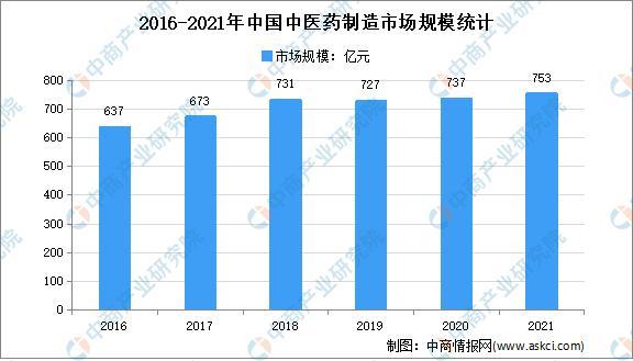 中國是僅次于美國的全球第二大制藥市場。其中,我國中藥制造市場從2016年637億元增至2020年737億元,年均復合增長率為3.7%。2021年我國中藥制藥市場規模達到753億元,呈上升趨勢。