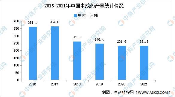近年來全國中成藥產量持續下降,2021年12月全國中成藥產量為24.6萬噸,同比下降3.9%。2021年全國中成藥產量為231.8萬噸,同比下降0.04%。