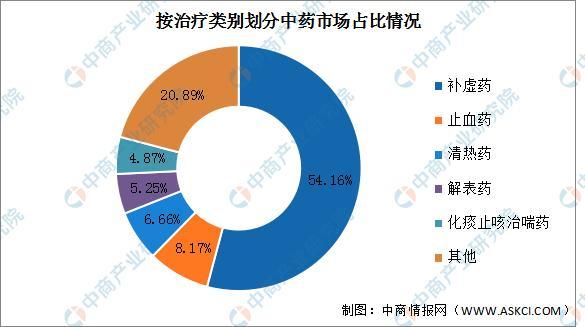 按治療類別劃分,中藥市場前五分別為補虛藥、止血藥、清熱藥、解表藥、化痰止咳治喘藥。其中,補虛藥獨占鰲頭,占比達54.16%,超過一半。止血藥、清熱藥、解表藥、化痰止咳治喘藥占比分別為8.17%、6.66%、5.25%及4.87%。