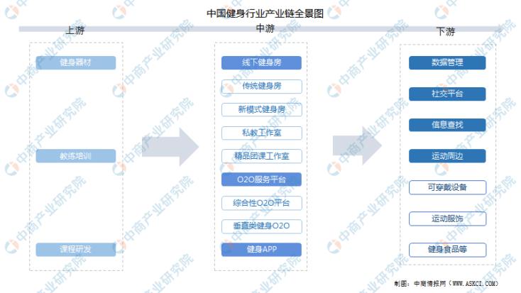 健身行業上游包括健身器材、教練培訓、課程研發;中游包括線下健身房、O2O服務平臺、健身APP,覆蓋線上線下各類健身場景;下游包括數據管理、社交平臺、信息查找、運動周邊,滿足消費者不同衍生需求。