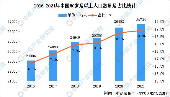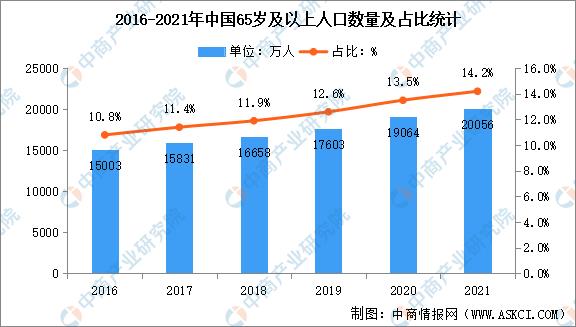 我國(guó)老年人口規(guī)模龐大,自2000年邁入老齡化社會(huì)之后,人口老齡化程度持續(xù)加深。2021年中國(guó)60歲及以上人口26736萬人,比上年增加992萬人,占全國(guó)人口的18.9%,比上年提高了0.7個(gè)百分點(diǎn)。65歲及以上人口突破2億人達(dá)到20056萬人,比上年增加334萬人,占全國(guó)人口的14.2%,比上年提高了0.2個(gè)百分點(diǎn)。