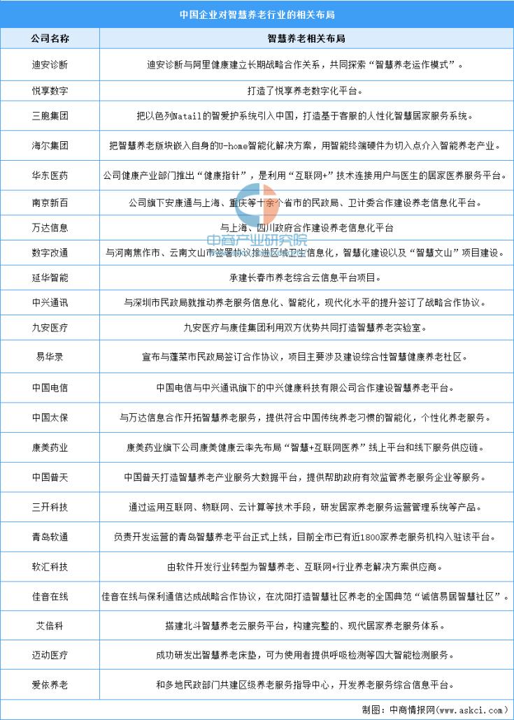近年來,在政策紅利驅(qū)動(dòng)下,越來越多企業(yè)布局投資智慧養(yǎng)老行業(yè)。非醫(yī)療行業(yè)的公司也在搶占智慧養(yǎng)老市場(chǎng),其中科技和通訊行業(yè)布局趨勢(shì)明顯。如萬達(dá)信息與上海、四川政府合作建設(shè)養(yǎng)老信息化平臺(tái);中興通訊與深圳市民政局就推動(dòng)養(yǎng)老服務(wù)信息化、智能化,現(xiàn)代化水平的提升簽訂了戰(zhàn)略合作協(xié)議;三開科技通過運(yùn)用互聯(lián)網(wǎng)、物聯(lián)網(wǎng)、云計(jì)算等技術(shù)手段,研發(fā)居家養(yǎng)老服務(wù)運(yùn)營(yíng)管理系統(tǒng)等產(chǎn)品。具體布局情況如下: