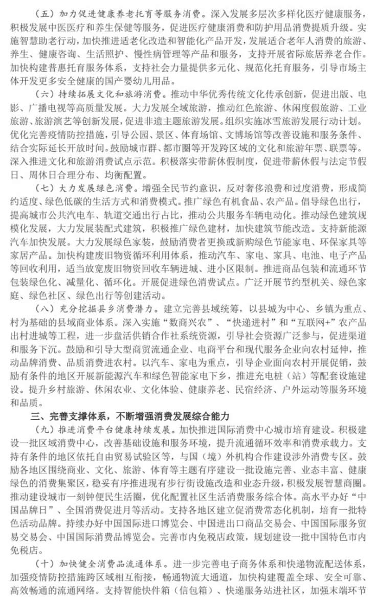 消費是最終需求,是暢通國內大循環的關鍵環節和重要引擎,對經濟具有持久拉動力,事關保障和改善民生。當前,受新冠肺炎疫情等因素影響,消費特別是接觸型消費恢復較慢,中小微企業、個體工商戶和服務業領域面臨較多困難。為深入貫徹習近平新時代中國特色社會主義思想,完整、準確、全面貫徹新發展理念,加快構建新發展格局,協同發力、遠近兼顧,綜合施策釋放消費潛力,促進消費持續恢復,經國務院同意,現提出以下意見。