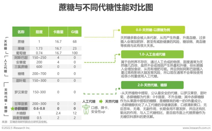 代糖本質并不是糖,但可以和糖一樣幫助食物產生甜味,也稱其為甜味劑。與糖最大的區別在于代糖幾乎不參與代謝、不產生熱量、不升高血糖。代糖主要分為人工代糖和天然代糖兩大類,此處主要以蔗糖為參考標準,對比人工代糖和天然代糖的特點,表中可看出大部分代糖都可以做到零GI值以及不產生熱量(阿斯巴甜和安賽蜜產生微量卡路里),但是人工代糖有可能存在影響健康安全的危險,而天然代糖尤其是糖醇類的赤蘚糖醇可以做到零GI值和零卡路里,長期食用不會發胖、口感還原度高、不會威脅大腦神經發育,食作為目前食品飲料甜味來源廣泛應用的優秀選手。