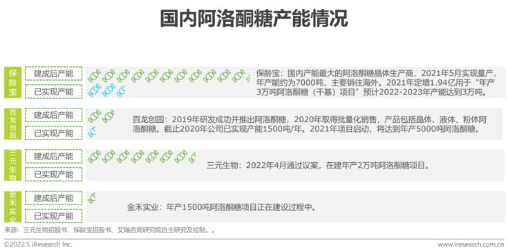 從長期來看,阿洛酮糖可作為新物質中產能、成本和健康安全性能等角度的最優解,阿洛酮糖成為目前功能糖廠商集中發力點。國內廠商中,保齡寶、百龍創園已在生產阿洛酮糖,三元生物、金禾實業也在規劃中,預計很快落地。建成后阿洛酮糖產能將為現有產能的6~7倍,表現出不俗的產能競爭優勢。