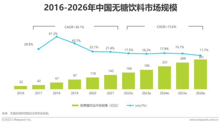 2026年預計該市場可達301億元,約為2021年的一倍之多,2022年至2026年CAGR為15.6%(增速相對放緩),相比前五年,屬于穩定較高速發展期,該階段下民眾對無糖飲料的接納從初期的新品嘗鮮轉化為日常消費,從爆發期的集中囤貨轉為穩定頻次購買。