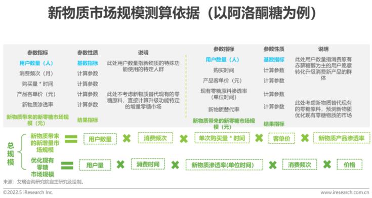 市場規模分為兩部分:第一部分考慮新物質具有抑制肥胖、易消化、降血糖、抑制2型糖尿病等特殊升級特點,所以新產品可以面向特殊人群售賣,為市場帶來增量部分;第二部分則認為新物質對腸胃負擔輕、降血糖的優勢會吸引一部分有高需求且價格敏感度低、更愿意為健康買單的消費者和原本有消費意愿但擔心赤蘚糖醇不足影響健康的消費者轉化到新物質市場。