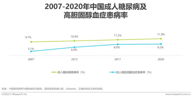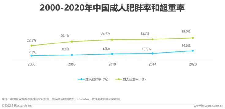 根據我國《國民檢測公報》可知,占人口基數最多的18歲以上成年人群體2020年超重或肥胖率已經超過一半(50.7%);呈逐年增加趨勢,2000年到2020年超重率從22.8%提升到35%,20年間超重人群占比增加12.2%;肥胖率2020年相比2000年以一倍速度增加(從7%增加至14.6%)。同時據《中國居民營養與慢性病狀況報告》發現過去近15年中成人(患病主流人群)糖尿病患病率從9.7%增加到11.9%,新增患病人數超過5000萬人。