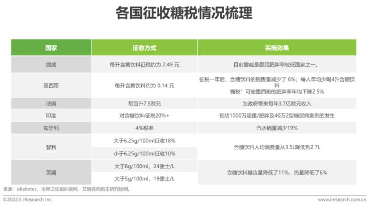 糖、脂、油等高攝入是引發糖尿病、高膽固醇血癥等相關疾病的重要原因之一,過量糖攝入帶來的危害已經嚴重威脅居民身體健康。WHO建議,如果對含糖飲料征稅使零售價提高至少20%,相關產品消費量就會相應減少,從而總體降低“游離糖”和熱量的攝入,可以改善營養,減少肥胖、糖尿病和齲齒等疾病患病人數。