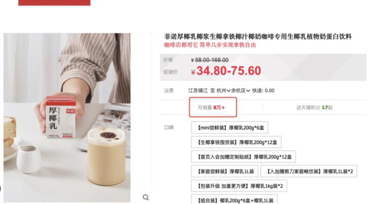 去年5月瑞幸的生椰拿鐵在全網大受追捧,異常火爆。由于太火爆,生椰拿鐵的“椰”出現斷貨,一時間全網求“椰”。一次”偶然”機會,有小紅書博主”意外”拍到并曝光了此“椰”的真面目--商家用了菲諾厚椰乳。再后來,更多博主和熱心網友發現并轉發了這篇文章,一時間費諾厚椰乳的關注度和銷量飛漲,僅三個月時間,菲諾厚椰乳就拿到了天貓植物蛋白飲料類目單品銷量第一的成績。