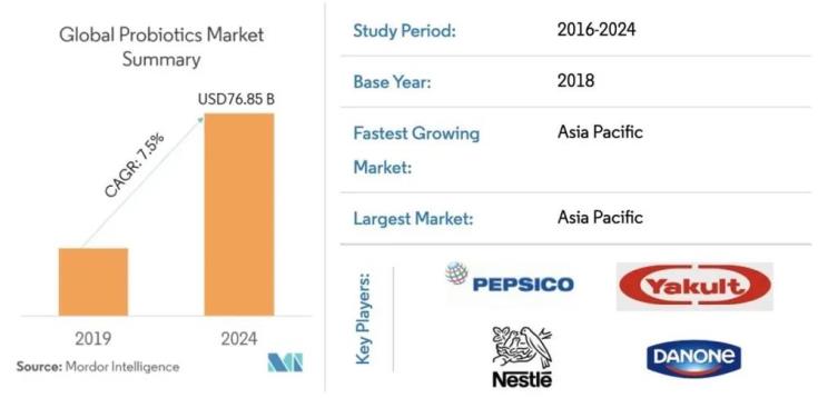 根據(jù)Mordor Intellgence的預(yù)測(cè),到2024年,全球益生菌市場(chǎng)預(yù)計(jì)將達(dá)到768.5億美元,在預(yù)測(cè)期內(nèi)(2019年至2024年),年增長(zhǎng)率預(yù)計(jì)為7.5%m,這在全球總體經(jīng)濟(jì)下行的趨勢(shì)下,顯得格外亮眼。