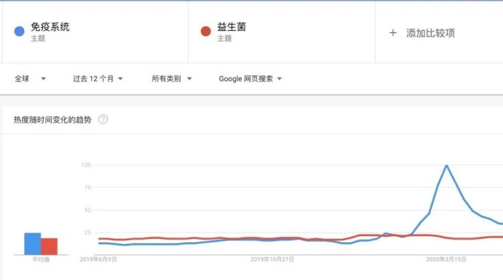 圖注:Google指數(shù)中免疫系統(tǒng)與益生菌對(duì)比