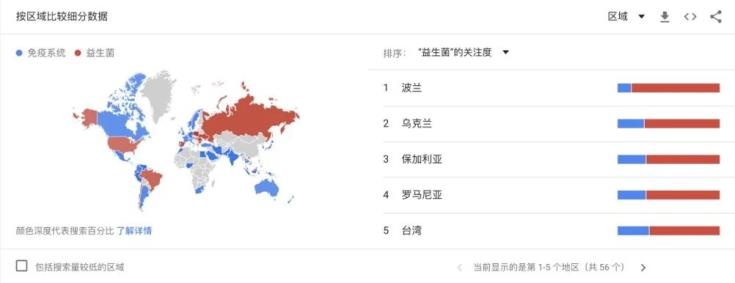 人們都在關(guān)注自己的免疫系統(tǒng),而提高免疫力可能有很多途徑,哪些地區(qū)的人們更關(guān)注益生菌對(duì)于免疫系統(tǒng)的提升情況呢?通過過去一年的搜索指數(shù)不難看出,歐洲消費(fèi)者對(duì)于益生菌的興趣更為濃厚,這跟該行業(yè)在該地區(qū)較久的發(fā)展歷史也有關(guān)系。
