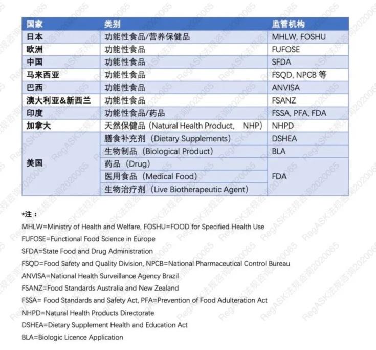 圖注:各主要市場(chǎng)對(duì)益生菌的產(chǎn)品分類及監(jiān)管機(jī)構(gòu)