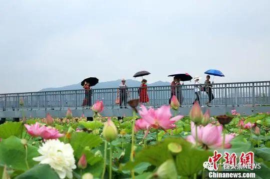 游客在貴港市荷美覃塘景區賞荷。韋東保 攝