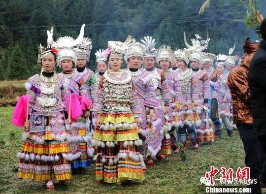 柳州市融水苗族自治縣安太鄉元寶村整朵苗寨舉辦一年一度的傳統坡會,參加坡會的苗族姑娘穿著盛裝。韋鼎標 攝