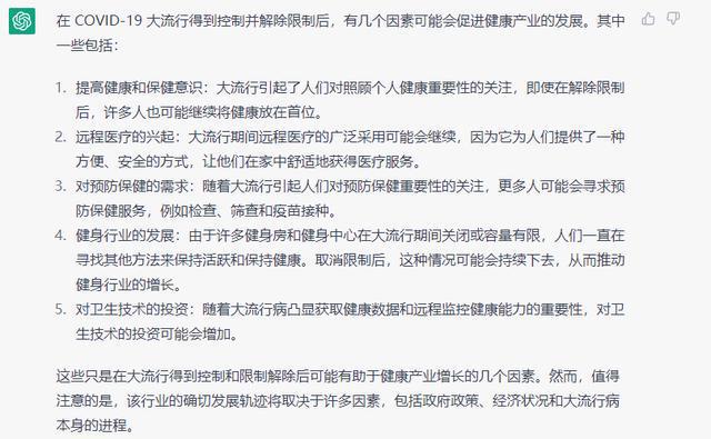 它從健康意識、遠程醫療、消費者健康需求、健身、衛生技術投資5個方面來解答了,不過神來之筆是末尾那段轉折,越看越覺得“ChatGPT”在演“上岸人”。