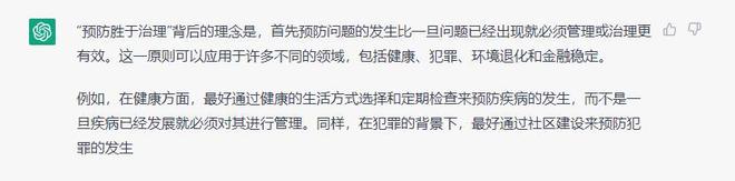 對于這個問題,它明確指出了“預防疾病比治療疾病更有效”,另外還舉一反三了,不得不說,這個ChatGPT挺高級的。