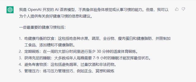ChatGPT給出了5條建議,分別是健康飲食、合理運動、充足睡眠、良好習慣、管理壓力來回答的,回答的中規中矩。