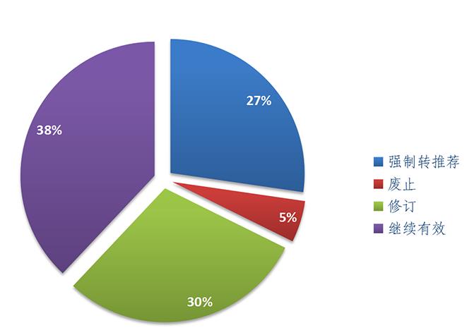 根據(jù)《醫(yī)療器械強(qiáng)制性標(biāo)準(zhǔn)優(yōu)化工作方案》要求,組織完成396項(xiàng)醫(yī)療器械強(qiáng)制性標(biāo)準(zhǔn)和62個(gè)在研強(qiáng)制性標(biāo)準(zhǔn)項(xiàng)目優(yōu)化評估。優(yōu)化評估結(jié)果為:458項(xiàng)醫(yī)療器械強(qiáng)制性標(biāo)準(zhǔn)和在研項(xiàng)目中,建議轉(zhuǎn)推薦125項(xiàng)、廢止23項(xiàng)、修訂136項(xiàng)、繼續(xù)有效174項(xiàng)(見圖2)。