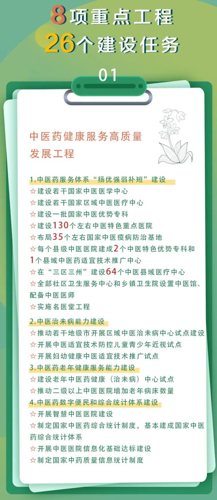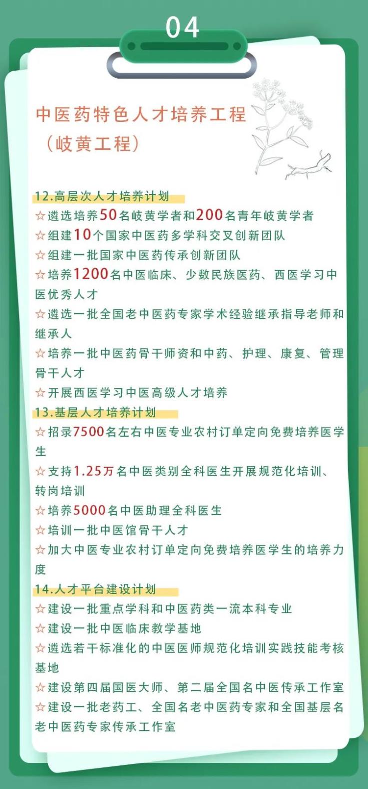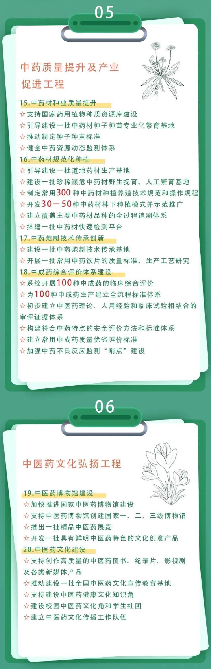 《方案》從中醫藥健康服務高質量發展工程、中西醫協同推進工程、中醫藥傳承創新和現代化工程、中醫藥特色人才培養工程(岐黃工程)、中藥質量提升及產業促進工程、中醫藥文化弘揚工程、中醫藥開發發展工程、國家中醫藥綜合改革試點工程、保障措施九大方面全面闡述國家對中醫藥振興發展的措施。