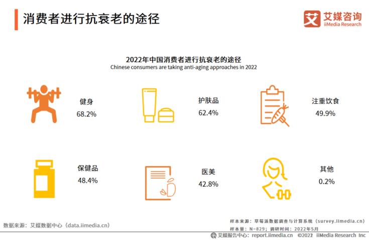 iiMedia Research(艾媒咨詢)數據顯示,68.2%的消費者通過健身進行抗衰老,62.4%的消費者使用護膚品進行抗衰老,注重飲食和服用保健品進行抗衰老的消費者也有將近五成。艾媒咨詢分析師認為,隨著抗衰老護膚品和保健品成分的迭代升級,將會有更多消費者認可抗衰成分的有效性,并通過使用護膚品和服用保健品進行抗衰老。
