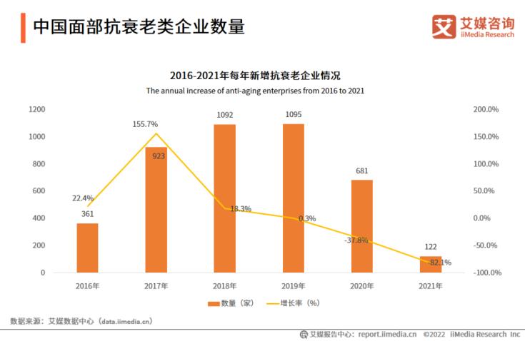 近年來,抗衰老企業數量增長迅速,其中2018年和2019年新增抗衰老企業超過1000家,抗衰老行業競爭激烈,2020年和2021年受疫情影響,抗衰老新增企業數量有所下降。艾媒咨詢分析師認為,隨著人們對抗衰老認識程度的加深,更加追求抗衰老產品的品質,抗衰老企業會進一步優勝劣汰,企業新增速度放緩。