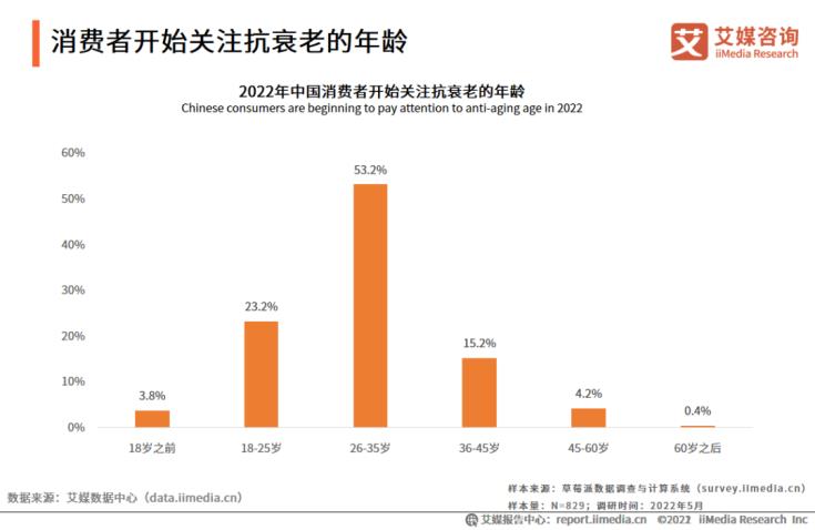 iiMedia Research(艾媒咨詢)數據顯示,53.2%的消費者在26-35歲時開始注重抗衰老,23.2%的消費者在18-25歲時開始注重抗衰老。艾媒咨詢分析師認為,隨著抗衰老行業的深入發展及抗衰老知識的普及應用,關注抗衰老的人群越來越年輕化,消費抗衰老產品的群體將不斷擴大。