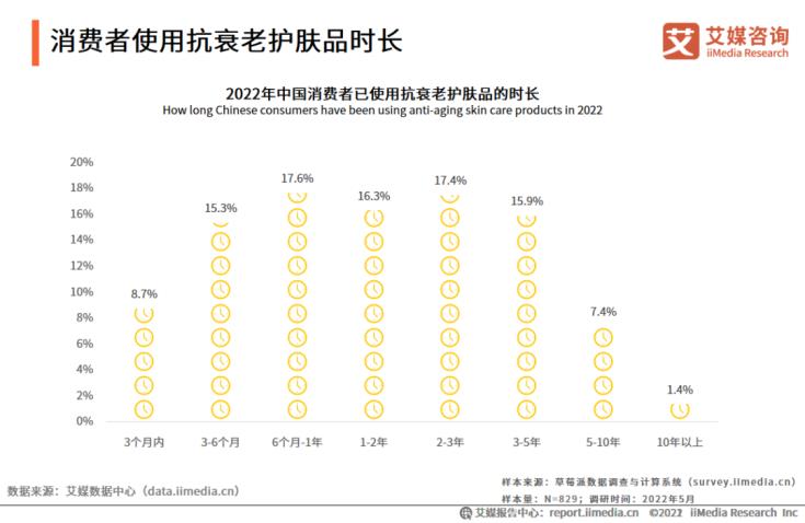 iiMedia Research(艾媒咨詢)數據顯示,使用抗衰老護膚品時長為6個月-1年的消費者數量最多,占比17.6%,其次是使用2-3年的消費者,占比17.4%,使用1-2年的消費者占比16.3%。艾媒咨詢分析師認為,五成以上消費者使用抗衰老護膚品的時長為6個月-3年,大部分消費者在近三年里使用抗衰老護膚品,抗衰老護膚品要持續迭代升級抗衰成分的有效性,以贏得更多消費者的認可。