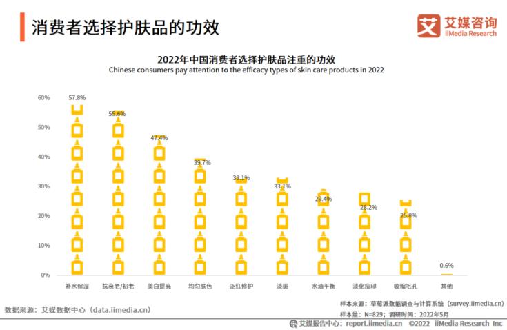 iiMedia Research(艾媒咨詢)數據顯示,消費者選擇護膚品時最注重補水保濕的功效,占比57.8%,其次是抗衰老功效,占比55.6%。艾媒咨詢分析師認為,消費者在選擇護膚品時,抗衰老需求較高,未來抗衰老護膚品行業發展前景明朗。