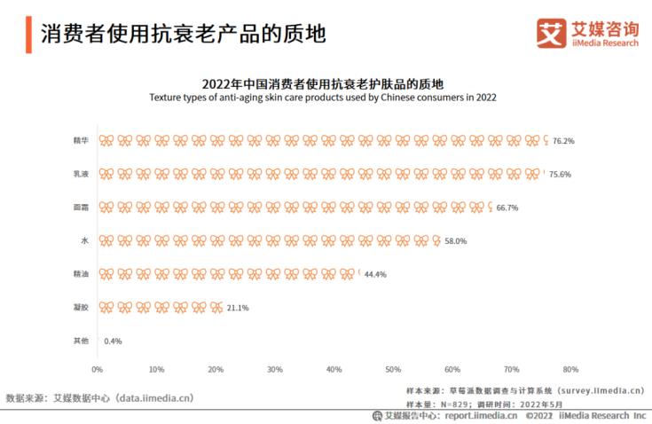 iiMedia Research(艾媒咨詢)數據顯示,使用抗衰老產品的消費者中,76.2%選擇精華質地,75.6%選擇乳液質地,66.7%選擇面霜質地。艾媒咨詢分析師認為,消費者進行抗衰老時,更加青睞精華、乳液、面霜質地的抗衰老產品,近年來興起的“以油護膚”概念也推動精油質地的抗衰老產品的發展。