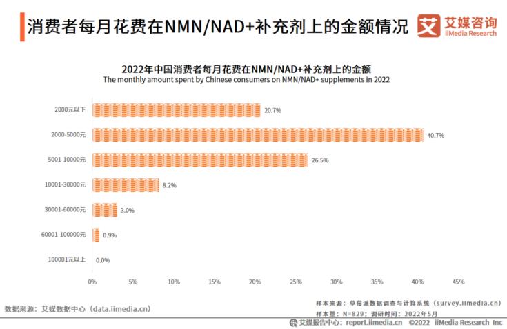 iiMedia Research(艾媒咨詢)數據顯示,40.7%的消費者每月花費在NMN/NAD+補充劑上的金額為2000-5000元,26.5%的消費者花費5001-10000元。艾媒咨詢分析師認為,NMN/NAD+補充劑的價格相對昂貴,但仍有近七成消費者花費在NMN/NAD+補充劑上的金額在2000-10000元區間,消費者逐漸提高對NMN/NAD+補充劑的認可度。