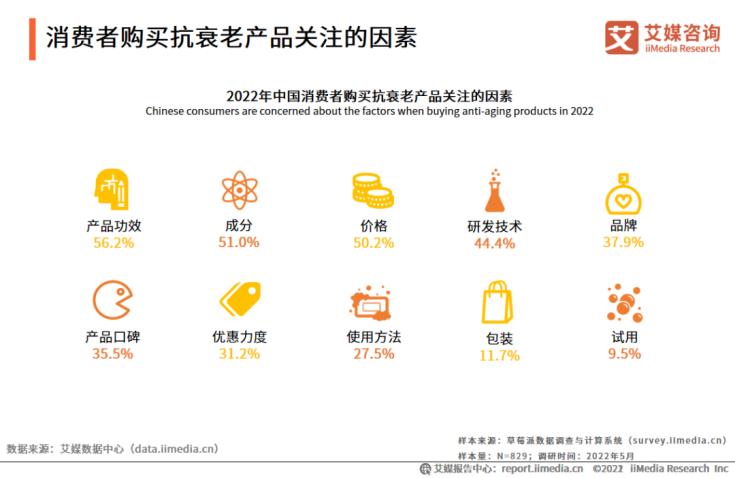iiMedia Research(艾媒咨詢)數據顯示,消費者在購買抗衰老產品時最關注的因素是產品功效,占比56.2%,其次是產品成分,占比51.0%,價格也是消費者著重考慮的因素之一。艾媒咨詢分析師認為,當下抗衰老需求旺盛,抗衰老產品種類豐富,產品功效不斷提高,成分更新迭代,抗衰老產品價格變得更親民,人們對于抗衰老產品價格的接受度越來越高,越來越關注產品的功效、成分和研發技術。