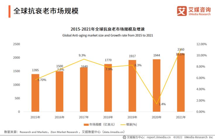 隨著全球人口老齡化的持續深化,“健康衰老”逐步發展成為新的消費市場。iiMedia Research(艾媒咨詢)數據顯示,2021年全球抗衰老市場規模為2160億美元,同比增速達11.1%。特別在中國消費升級、健康需求深化的情況下,中國延緩衰老的需求日益增長,抗衰老行業持續擴容。