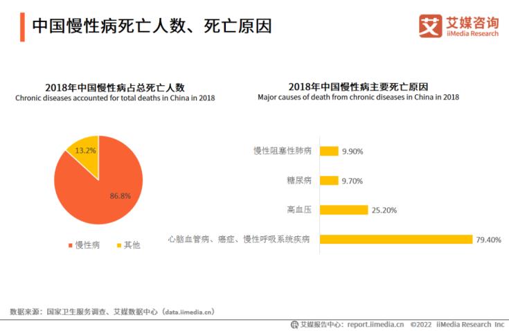 iiMedia Research(艾媒咨詢)數據顯示,2018年中國慢性病死亡人數占總死亡人數的86.8%,主要慢性病死亡原因中,心腦血管病、癌癥、慢性呼吸病占比79.4%。面對當前仍然嚴峻的慢性病防控形勢,黨中央、國務院高度重視,將實施慢性病綜合防控戰略納入《“健康中國2030”規劃綱要》,將合理膳食和重大慢病防治納入健康中國行動,進一步聚焦當前國民面臨的主要營養和慢性病問題。